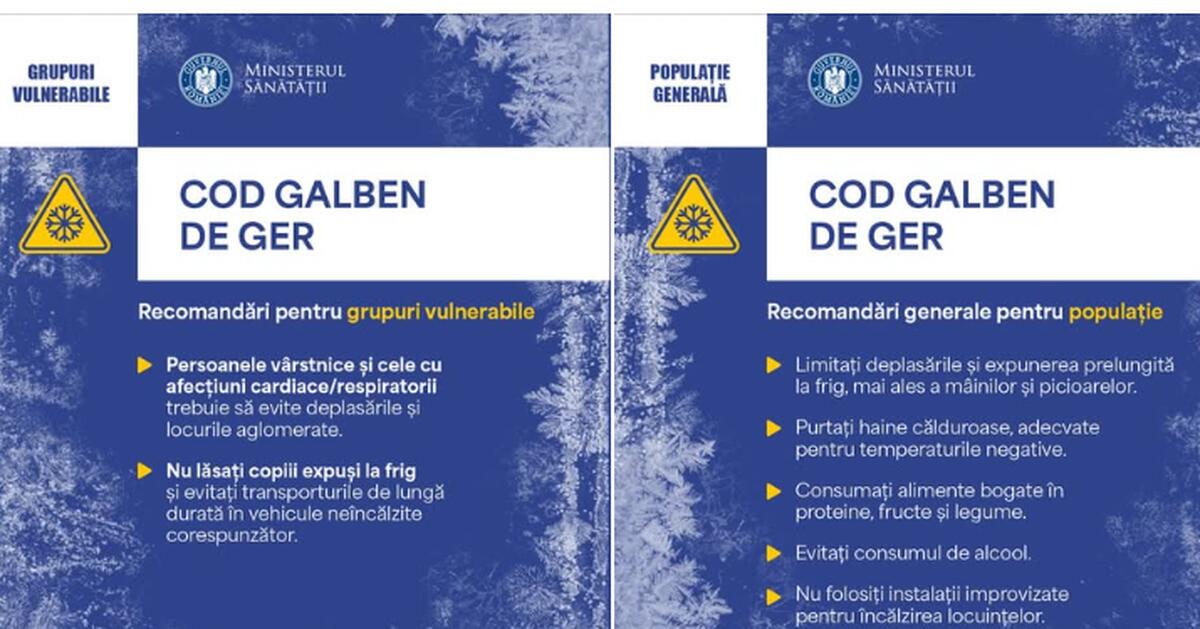 „În aceste zile cu temperaturi extrem de scăzute, Ministerul Sănătăţii recomandă populaţiei să asculte sfatul medicilor, să evite deplasările în spații deschise și expunerea la frig, să respecte regulile de igienă pentru evitarea îmbolnăvirilor şi să consume alimente bogate în proteine, fructe şi legume”, se arată în informare publicată, marți, de Ministerul Sănătății, pe Facebook.