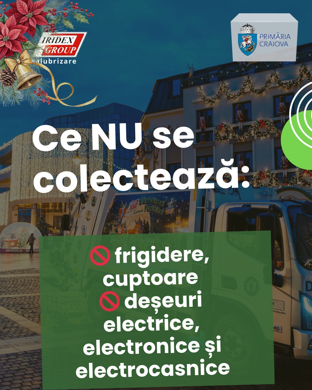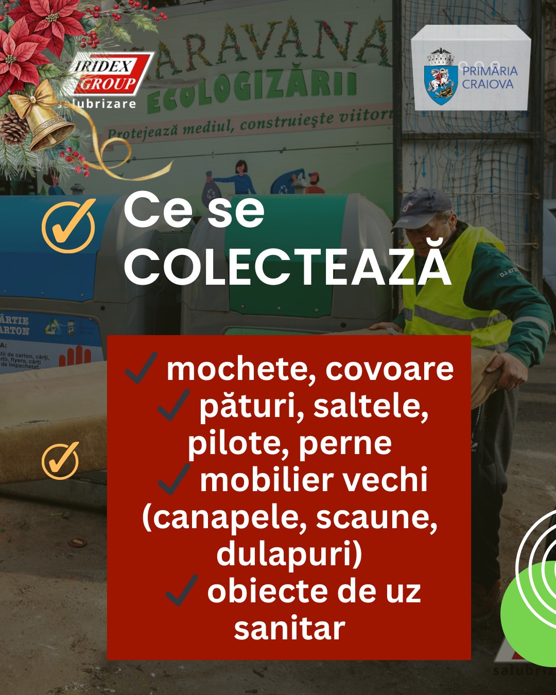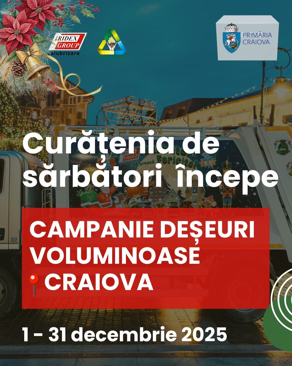 O nouă campanie de colectare a deșeurilor voluminoase ia startul, astăzi, la Craiova. Acțiunea este organizată de Iridex Group Salubrizare și ADI Ecodolj și se desfășoară în perioada 1–31 decembrie 2025.