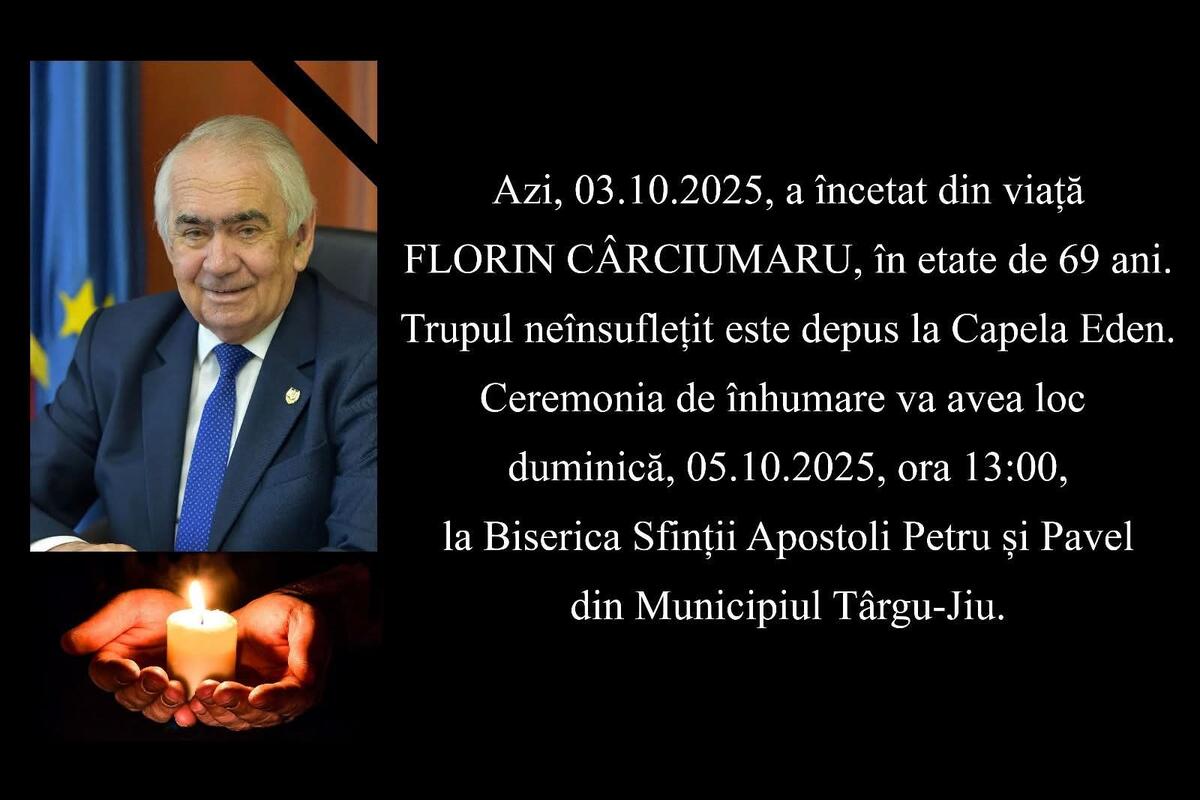 Fostul primar al municipiului Târgu Jiu, Florin Cârciumaru, va fi condus pe ultimul drum duminică, 5 octombrie 2025. Ceremonia de înmormântare va avea loc la ora 13:00, la Biserica „Sfinții Apostoli Petru și Pavel” din municipiul Târgu Jiu.