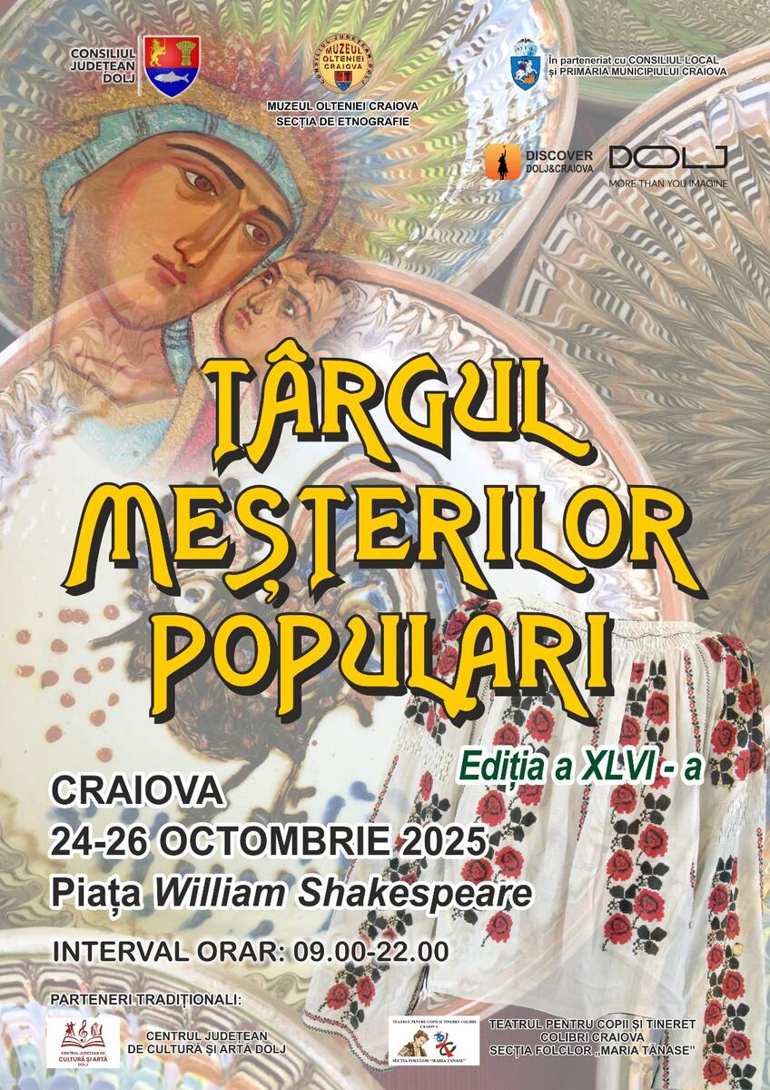 Muzeul Olteniei Craiova, Secția de Etnografie, organizează, în perioada 24-26 octombrie, în Piața „William Shakespeare” din Craiova, a XLVI-a ediție a Târgului Meșterilor Populari, reper al tradițiilor și spiritualității populare românești, ce aduce laolaltă, într-un spațiu carismatic din Cetatea Băniei, peste 50 de meșteri populari din toată țara.
