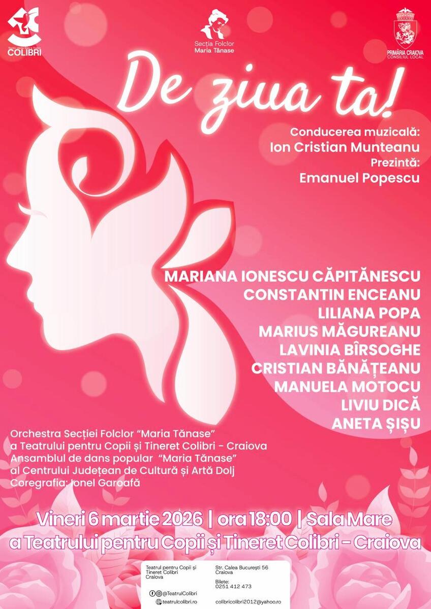 Pe 6 martie, de la ora 18.00, scena Teatrul pentru Copii și Tineret Colibri găzduiește spectacolul „De ziua ta”, un eveniment dedicat Zilei Femeii. Producția este realizată de Secția Folclor „Maria Tănase” a teatrului, în parteneriat cu Centrul Județean de Cultură și Artă Dolj – Secția Ansamblul de dans popular „Maria Tănase”.