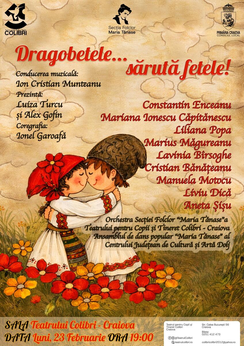 Teatrul pentru copii și tineret Colibri - Secția Folclor „Maria Tănase“, în parteneriat cu Centrul Județean de Cultură și Artă Dolj - Secția Ansamblul de dans popular „Maria Tănase” vă invită la spectacolul „Dragobetele sărută fetele”, ce se va desfăşura în data de 23 februarie 2026, de la ora 19:00 pe scena Teatrului Colibri.