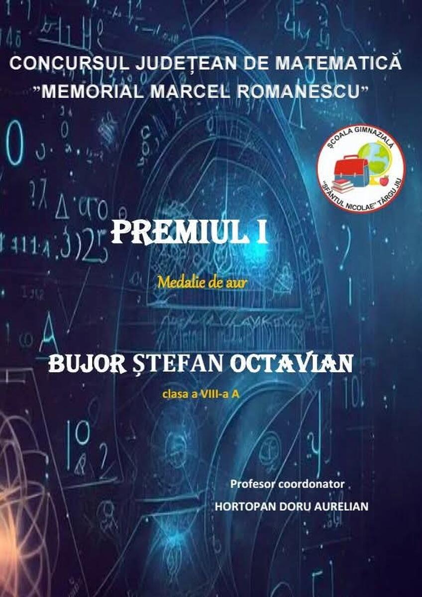 Un elev al Școlii Gimnaziale „Sfântul Nicolae” a obținut un rezultat deosebit la un concurs județean de matematică. Bujor Octavian a câștigat Premiul I și Medalia de Aur la competiția „Memorial Marcel Romanescu”, una dintre cele mai apreciate competiții școlare din județ.