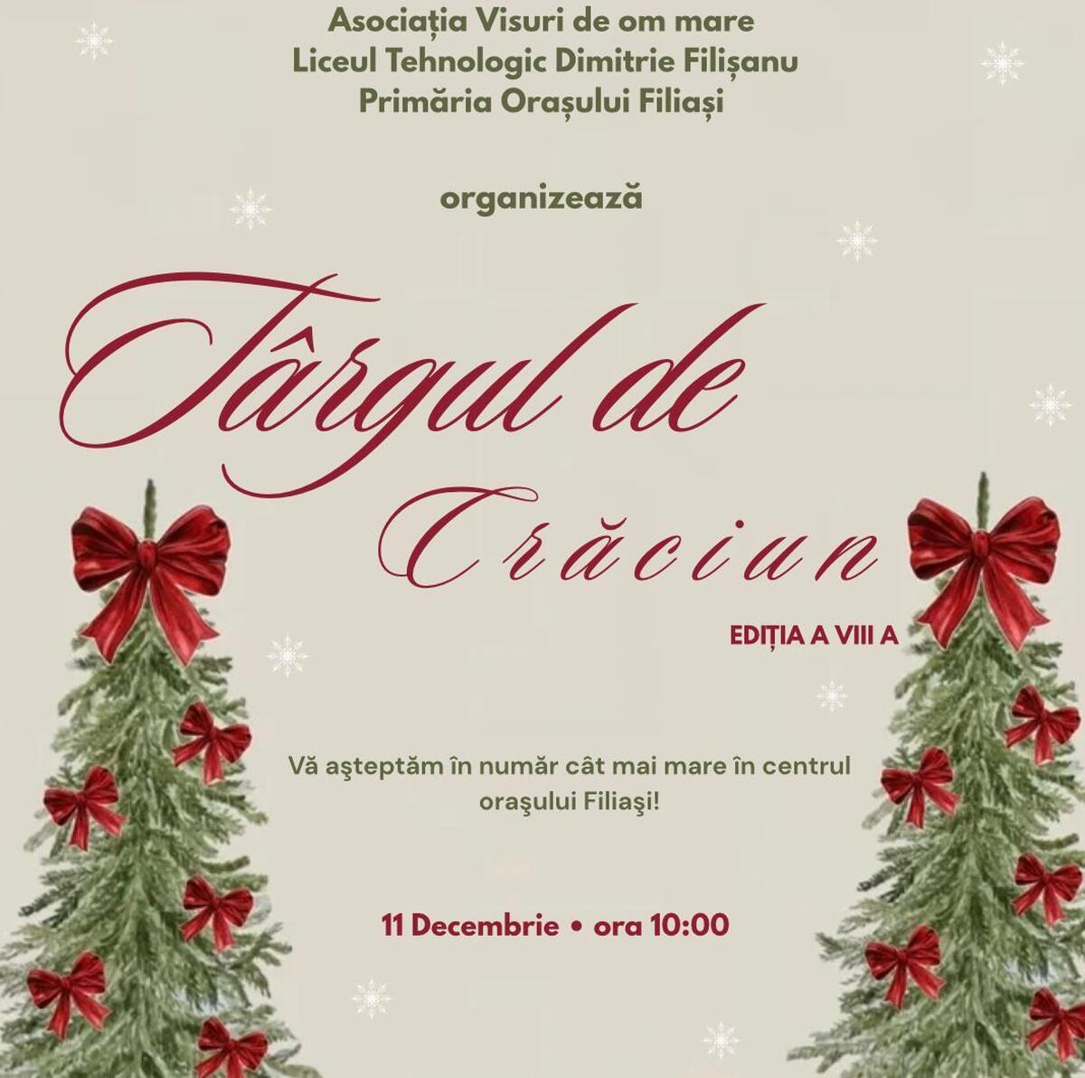 Elevii Liceului Tehnologic “Dimitrie Filișanul” organizează un Târg de Crăciun dedicat comunității, eveniment ce îmbină creativitatea cu spiritul caritabil. Participanții vor avea ocazia să descopere cadouri hand-made, dulciuri pregătite cu atenție, decorațiuni de sezon și să se bucure de momente artistice.