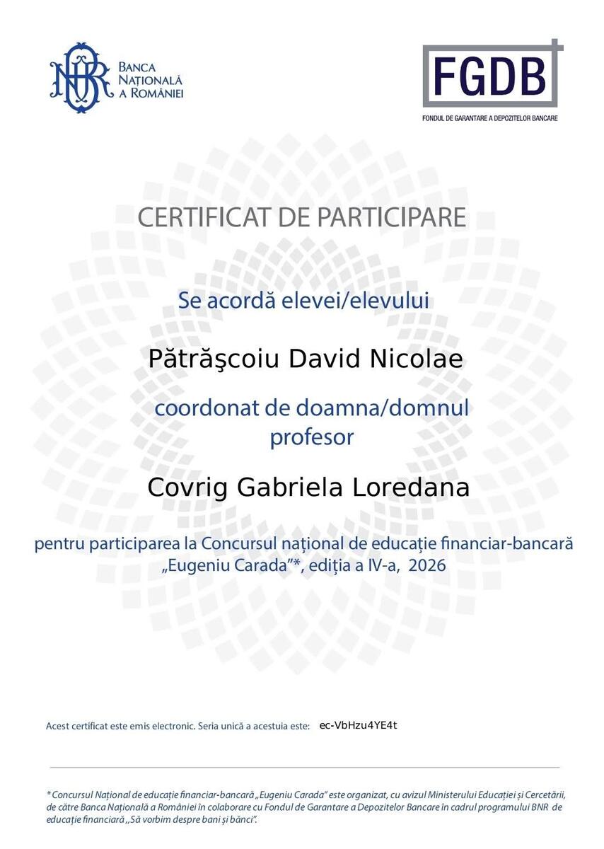 Elevul Pătrășcoiu David Nicolae de la Liceul Tehnologic „Ion Mincu”, coordonat de profesoara Covrig Gabriela Loredana, a obținut rezultate remarcabile la Concursul Național „Eugeniu Carada”, organizat de Banca Națională a României împreună cu Ministerul Educației și Cercetării.