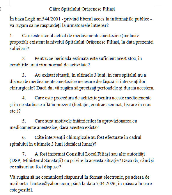 Spitalul Orășenesc Filiași nu comunică. Tăcere la solicitări care țin de interes public, tăcere la întrebări concrete. Nu e o scăpare, e o alegere. Iar alegerea asta spune clar cum e privit cetățeanul. Este un intrus care deranjează, nu ca titular al dreptului la informație.