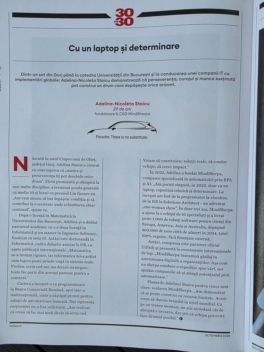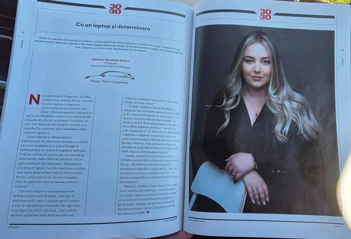 Această recunoaștere nu este doar a mea - aparține părinților mei, mentorilor mei, echipei mele și tuturor celor care au crezut în mine. Mulțumesc @stefana.arina pentru nominalizare! Faptul că faci astăzi parte din echipa Mindsherpa și contribui alături de mine la această călătorie înseamnă enorm. Mulțumesc @forbesromania pentru acest moment de poveste! Un vis împlinit, dar nu ultimul!”, a transmis Adelina Staicu, antreprenoare originară din Gorj.