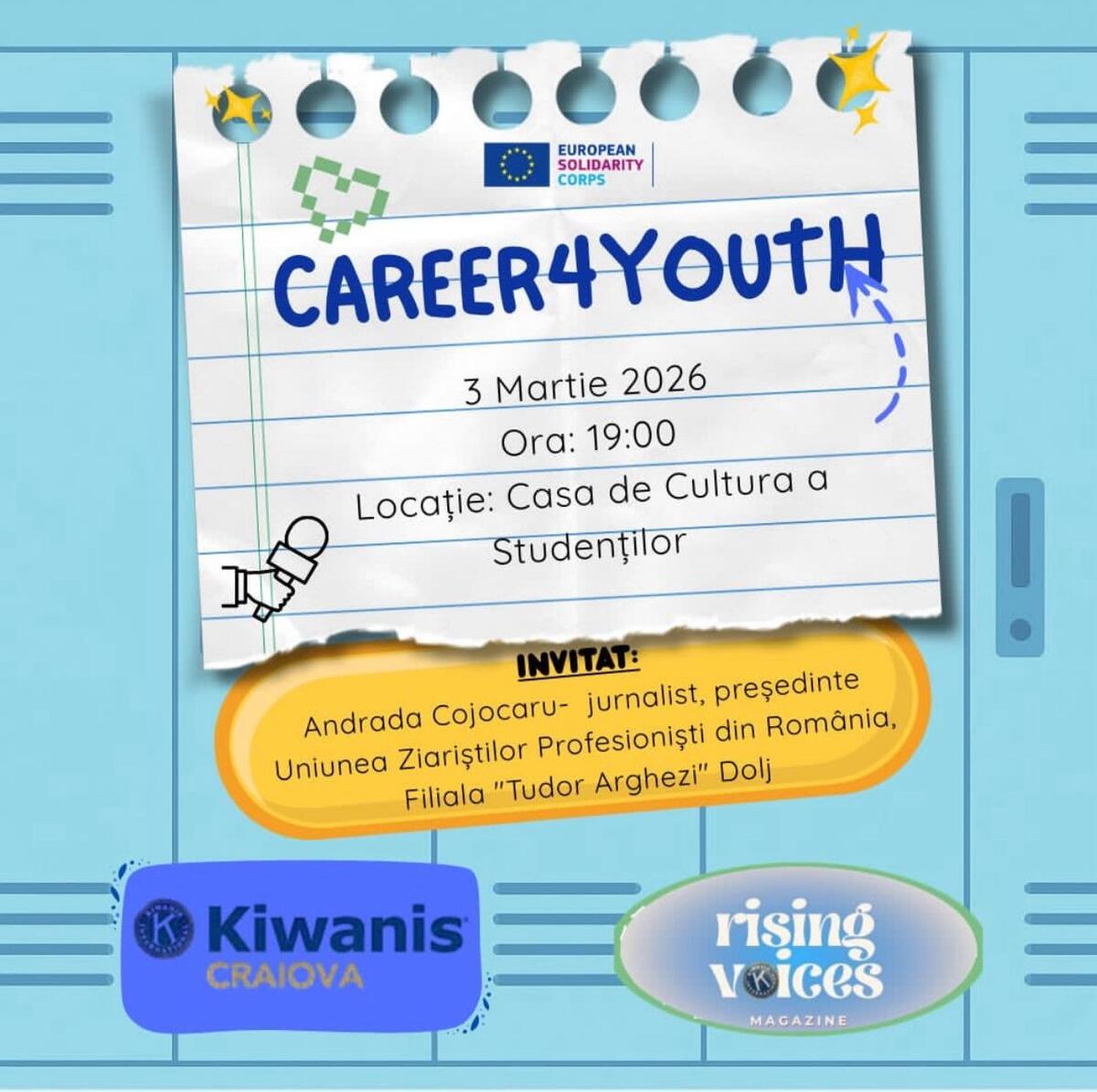 Elevii de liceu interesați de o carieră în jurnalism sunt invitați marți, 3 martie 2026, de la ora 19:00, la Casa de cultură a studenților, unde Key Club Kiwanis Craiova organizează o ediție specială a evenimentului “Career4Youth”.