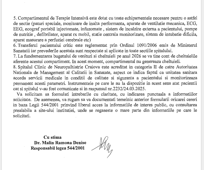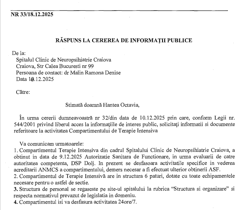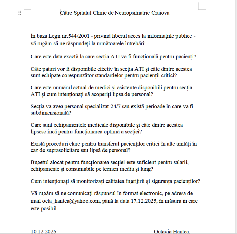 Spitalul de Neuropsihiatrie Craiova ar trebui să înțeleagă faptul că Legea 544 nu este o favoare pe care ne-o fac, ci o obligație. Și vom mai avea întrebări.