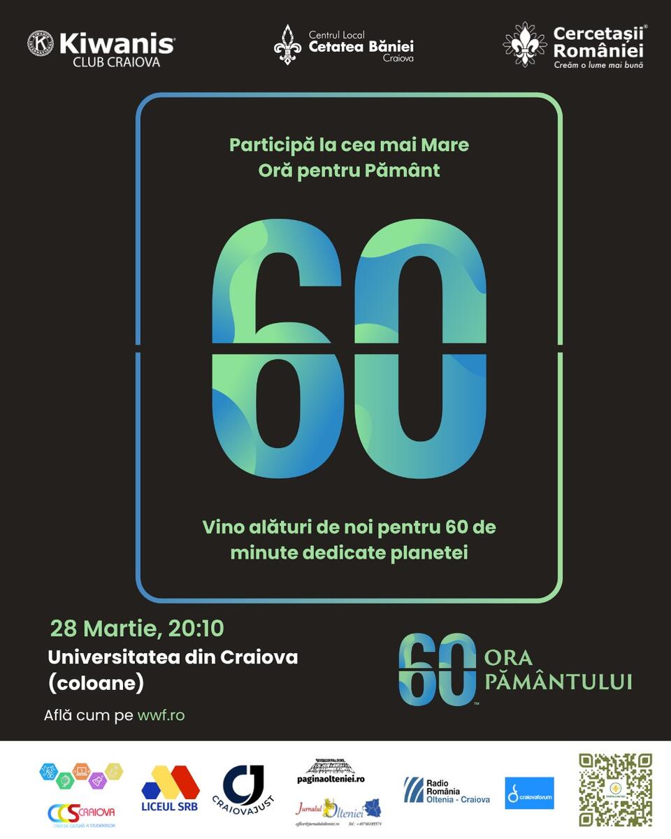 Kiwanis Club Craiova și Cercetașii României, Centrul Local „Cetatea Băniei”, pregătesc pentru 28 martie 2026 o ediție amplă a evenimentului „Ora Pământului”, desfășurată în Craiova. Inițiativa, parte din campania globală dedicată protejării mediului, aduce în prim-plan gesturile simple prin care oamenii pot reduce impactul asupra planetei.