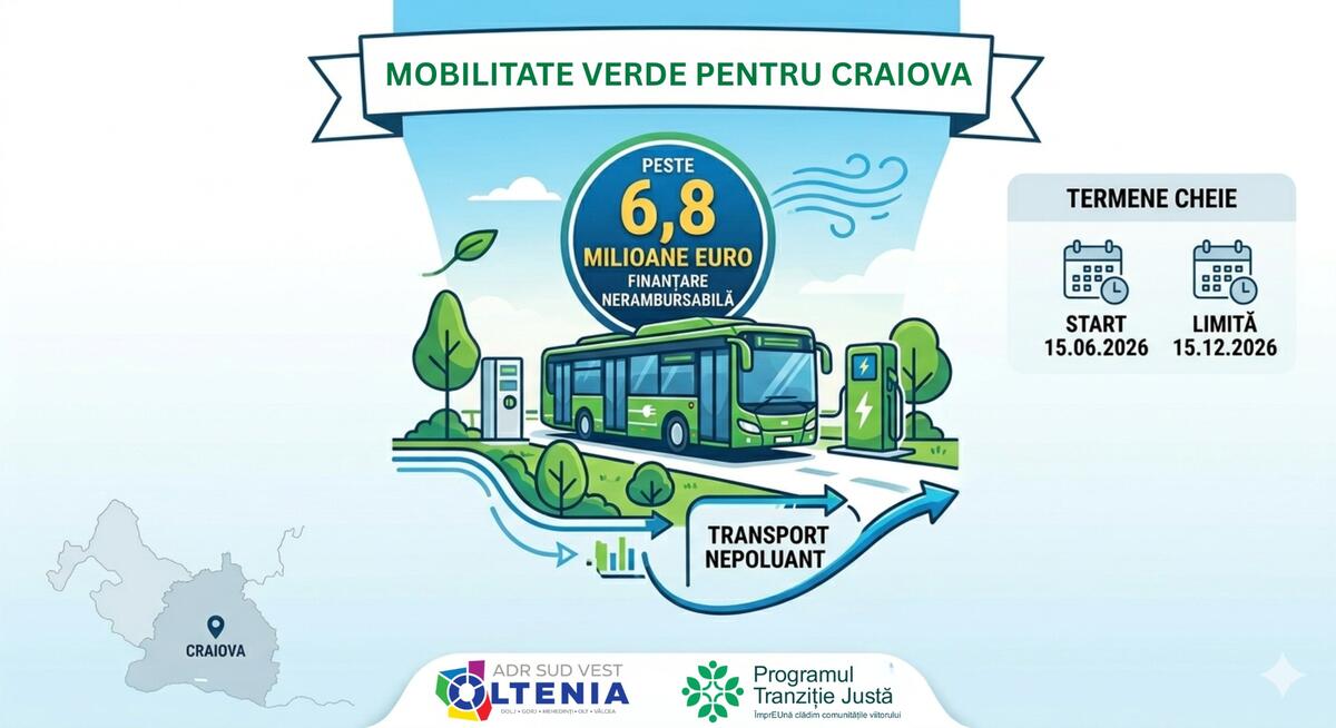 Autoritatea de Management pentru Programul Dezvoltare Durabilă și Tranziție Justă a publicat ghidul solicitantului pentru componenta „Mobilitate verde”, care deschide accesul la finanțare pentru modernizarea transportului public din Craiova. Bugetul total alocat este de 6.825.000 de euro, cu o rată de finanțare nerambursabilă de 98%, contribuția beneficiarului fiind de 2%.