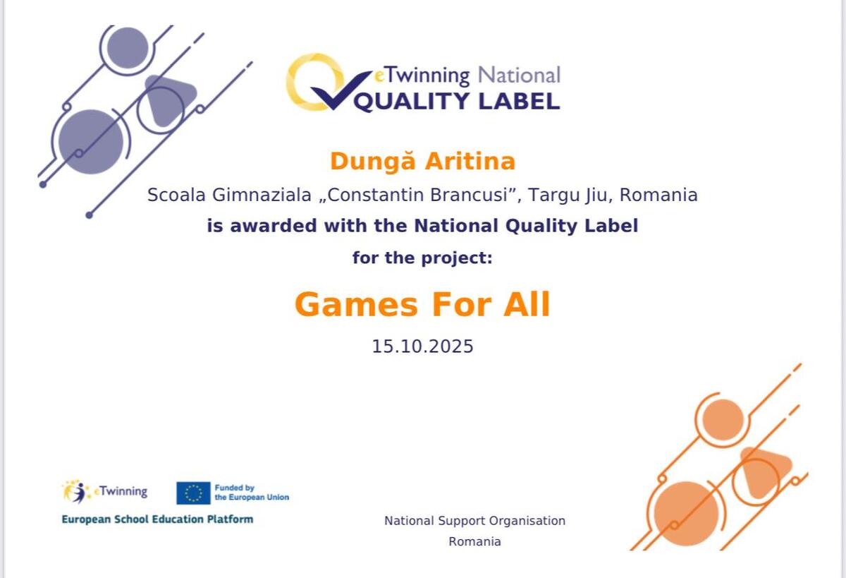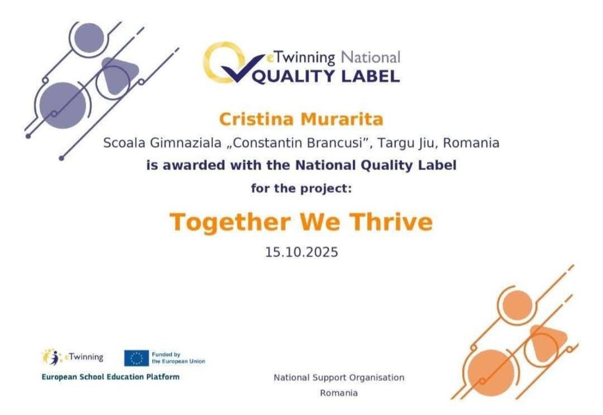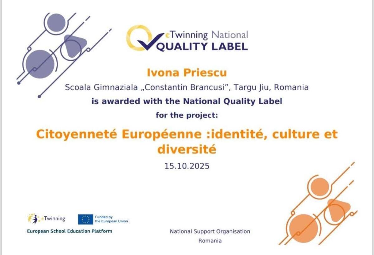 Trei cadre didactice de la Școala Gimnazială „Constantin Brâncuși” din Târgu Jiu — Dungă Aritina-Carmen, Priescu Ivona și Murărița Cristina — au fost recompensate cu Certificate Naționale de Calitate eTwinning pentru activitatea desfășurată în anul școlar 2024–2025.