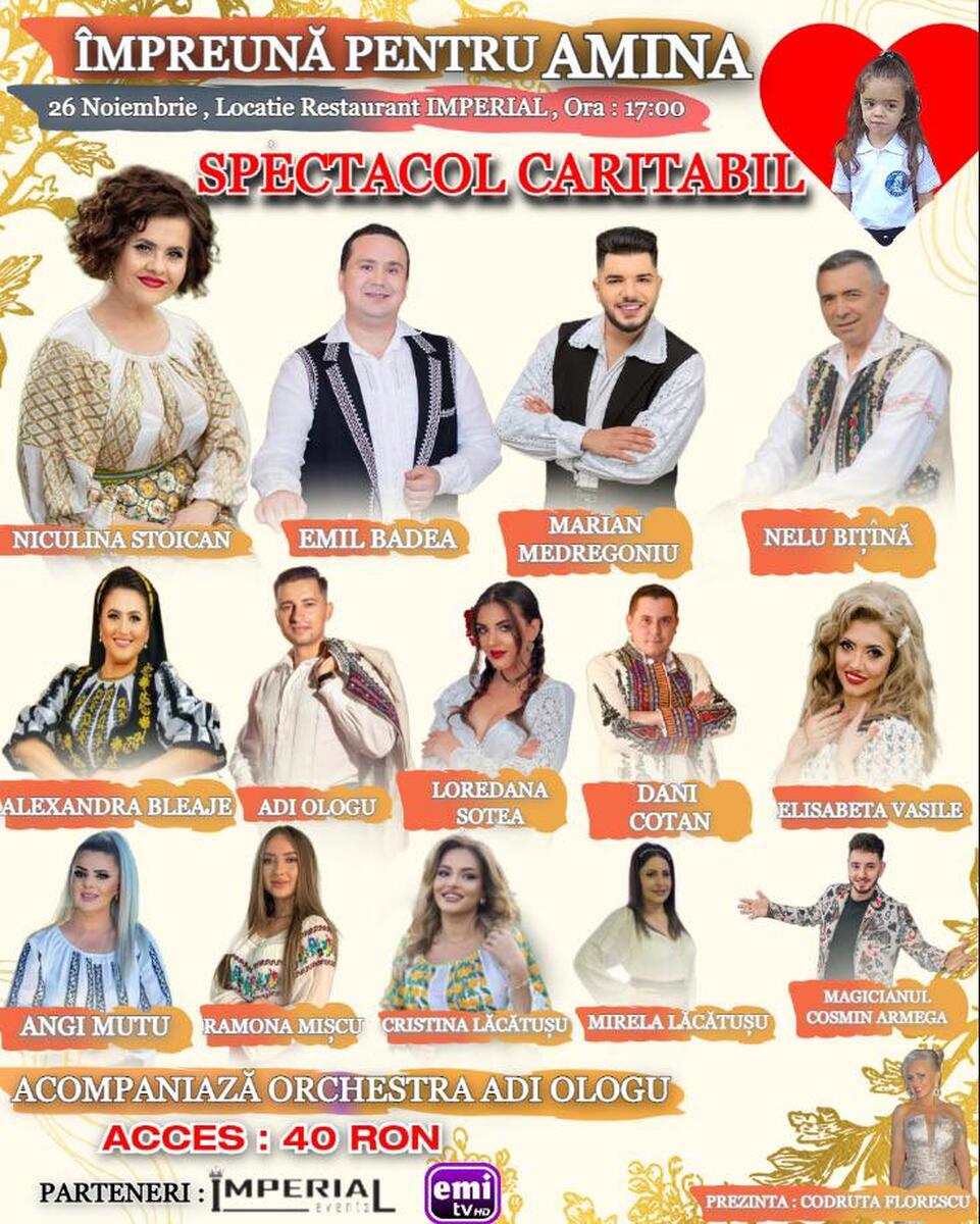 Un spectacol caritabil, “Împreună pentru Amina”, va avea loc la Târgu Jiu. Biletele au fost puse în vânzare, iar organizatorii speră ca sala Restaurantului Imperial să fie plină pe 26 noiembrie. Evenimentul are un scop clar. Strângerea fondurilor necesare pentru tratamentul în străinătate al Aminei, o fetiță aflată în fața unei lupte medicale pe care familia nu o poate duce singură.