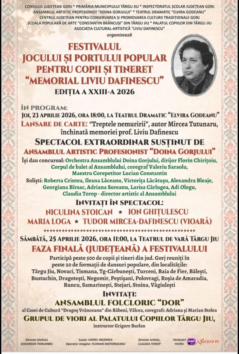 Evenimentul debutează joi, 23 aprilie 2026, de la ora 18:00, la Teatrul Dramatic „Elvira Godeanu”, cu lansarea cărții „Treptele nemuririi”, semnată de Mircea Tutunaru, dedicată memoriei profesorului Liviu Dafinescu. Seara continuă cu un spectacol susținut de Ansamblul Artistic Profesionist „Doina Gorjului”, alături de invitați speciali precum Niculina Stoican, Ion Ghițulescu și Maria Loga.