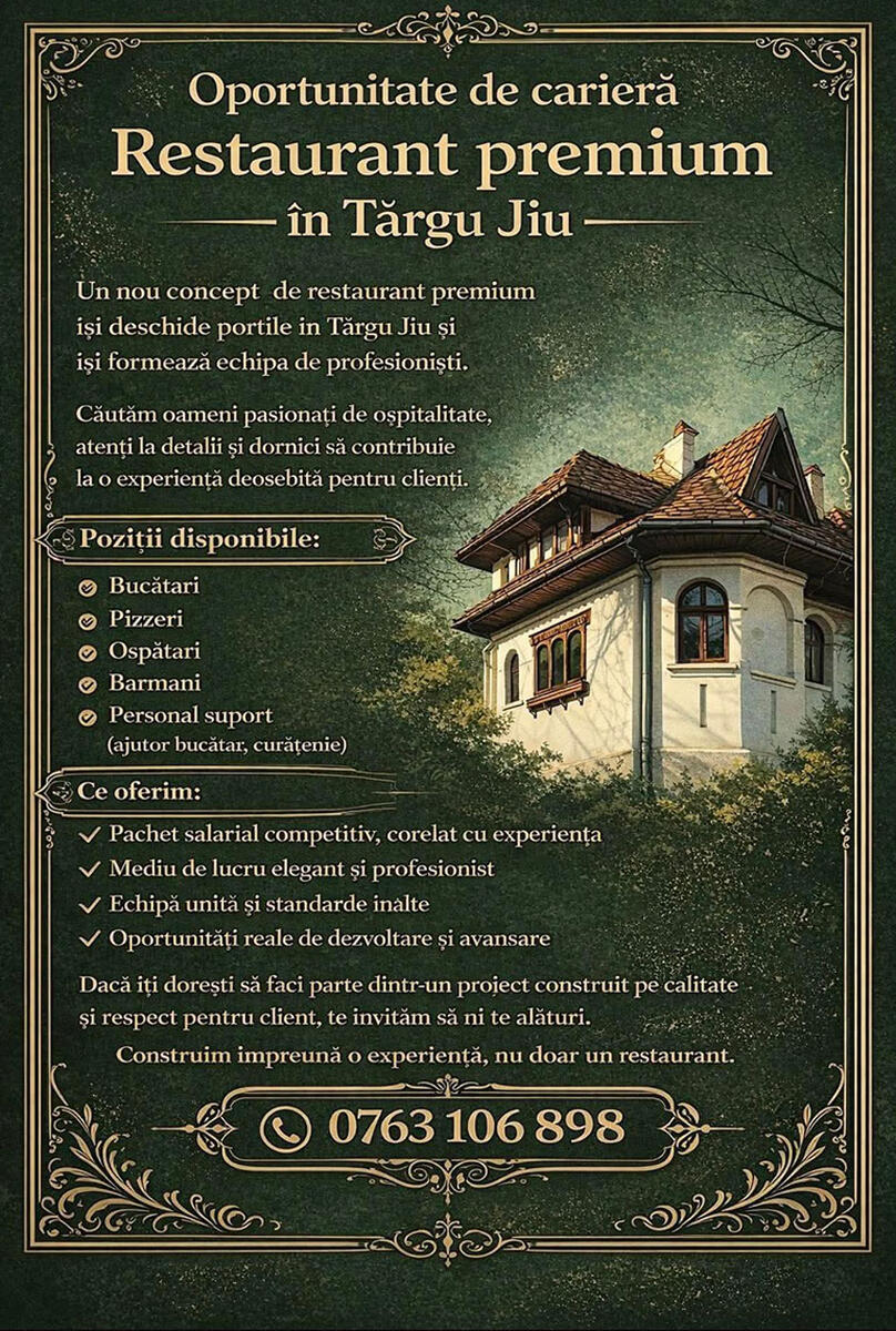 Sectorul serviciilor de alimentație publică din municipiul Târgu Jiu se extinde prin lansarea unui nou concept de restaurant premium. Unitatea va avea sediul în fostul restaurant „Gorjeanul” și își propune să își formeze o echipă completă de profesioniști înainte de inaugurare, punând accent pe standarde ridicate de servire și operare.