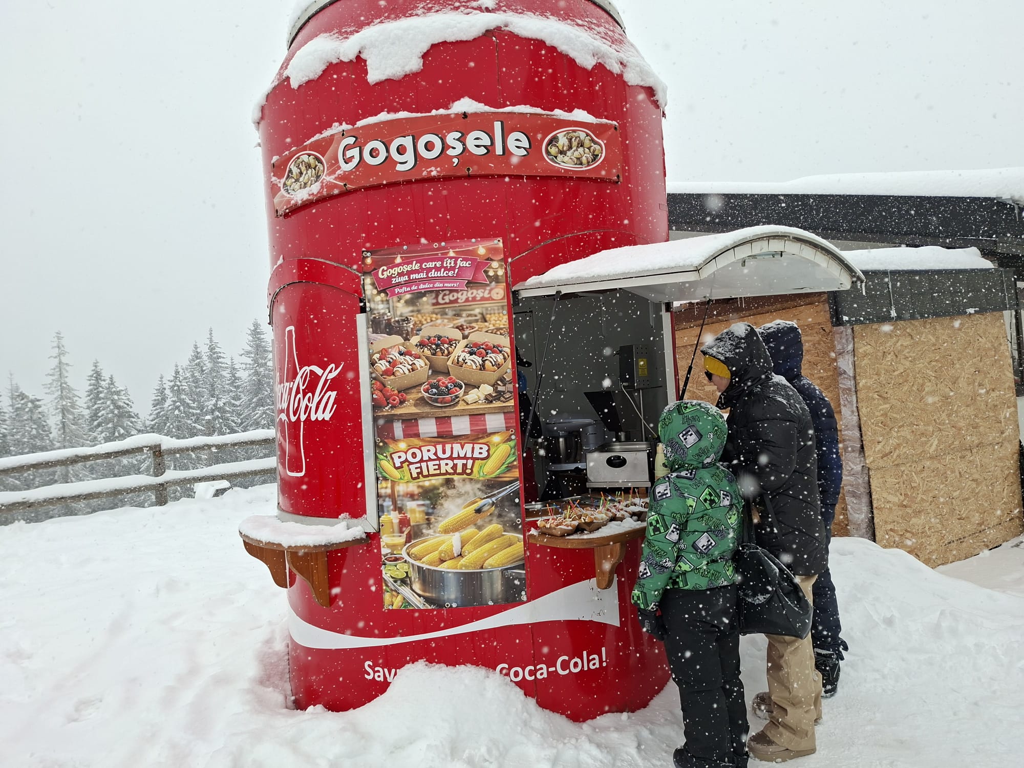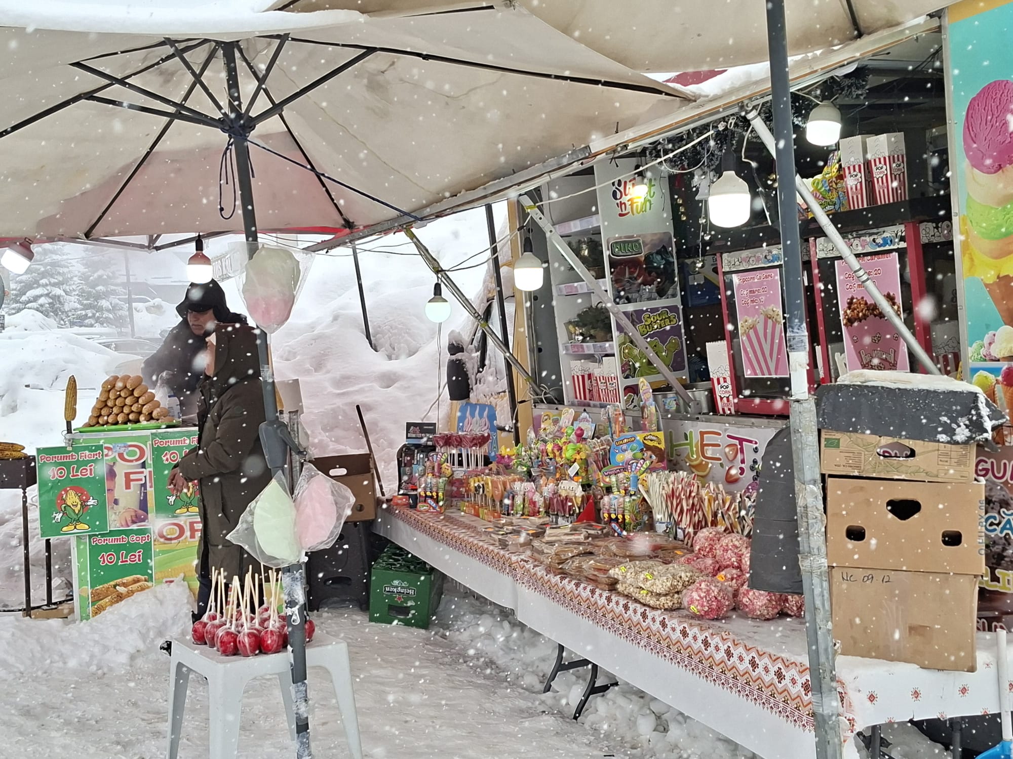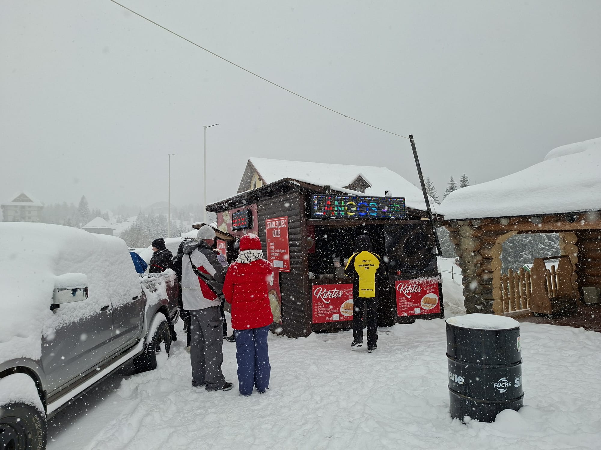 La baza pârtiei, aburii băuturilor calde se ridică deasupra tarabelor. Cafeaua costă 10 lei, vinul fiert 15 lei, ciocolata caldă 17 lei, iar sucurile 15 lei. La câțiva pași, mirosul de aluat prăjit atrage turiștii. 30 de lei costă o porție de gogoși, 20 de lei un langoș, 30 de lei un kürtőskalács. Se găsește și porumb fiert, iar mesele rapide sunt la îndemână pentru cei care nu vor să piardă timp departe de zăpadă.