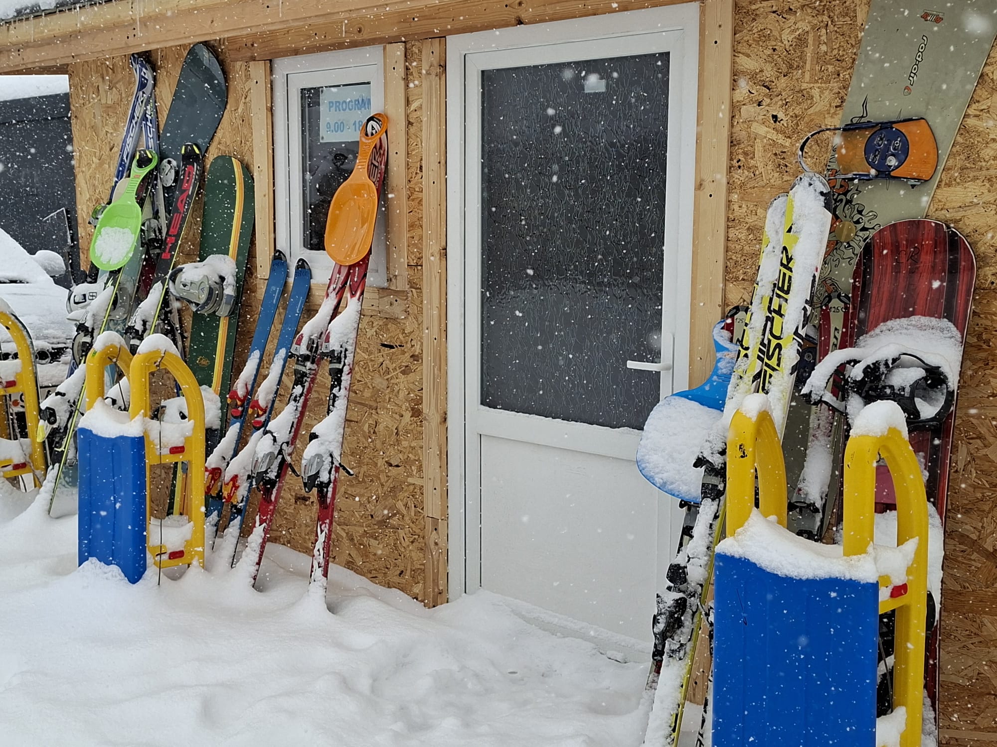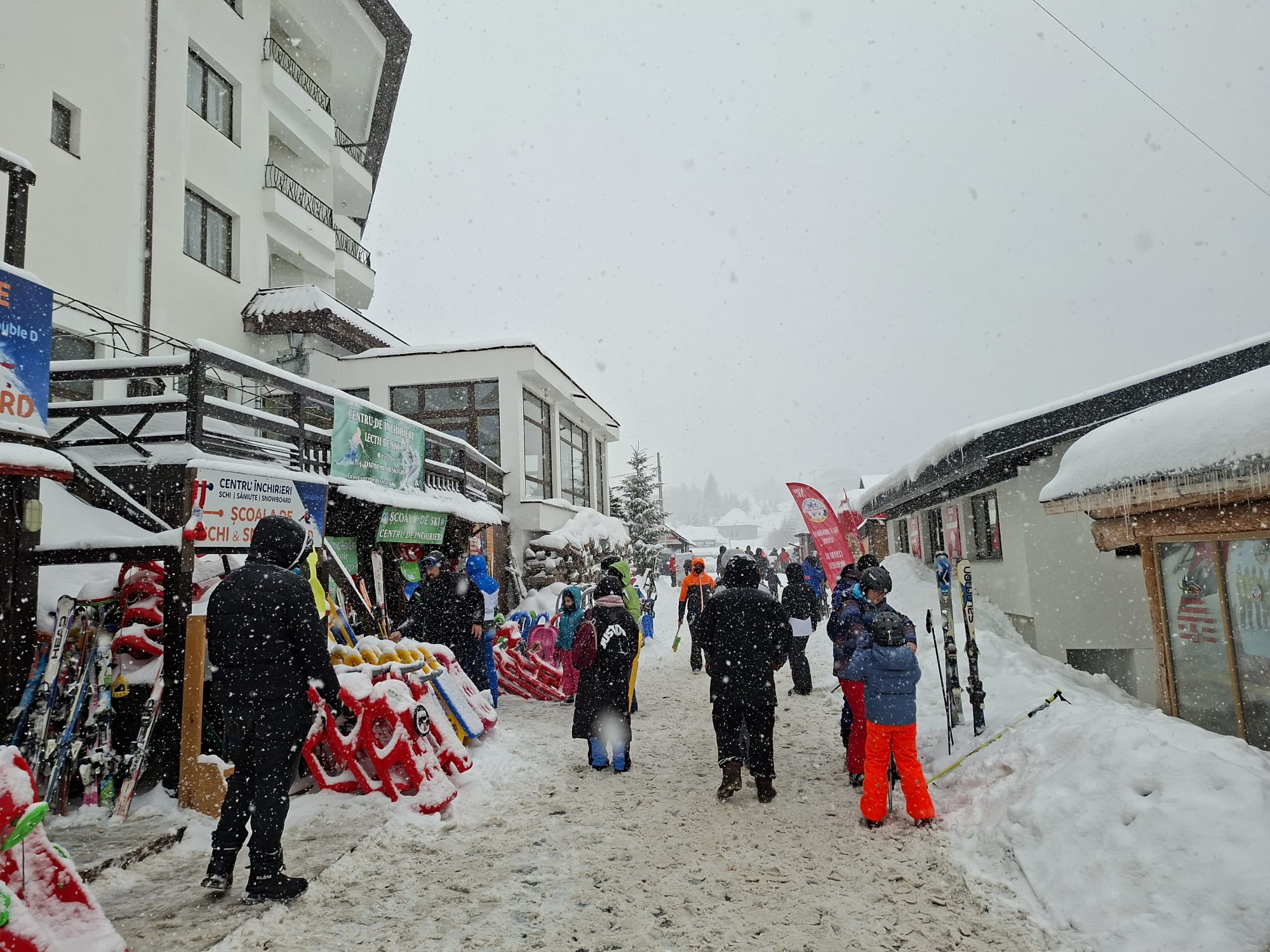 „Am venit special pentru că pârtia e bună și e potrivită pentru copil. E prima lui zi pe schiuri”, spune un tătic din Dolj, în timp ce își așteaptă rândul la echipament.